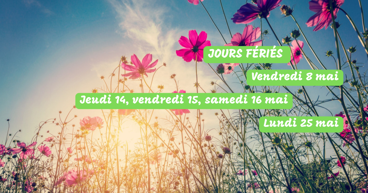 Il n'y aura aucun cours vendredi 8 mai, jeudi 14 mai (Ascension), vendredi 15 mai, samedi 16 mai (Pont) et lundi 25 mai (Pentecôte).